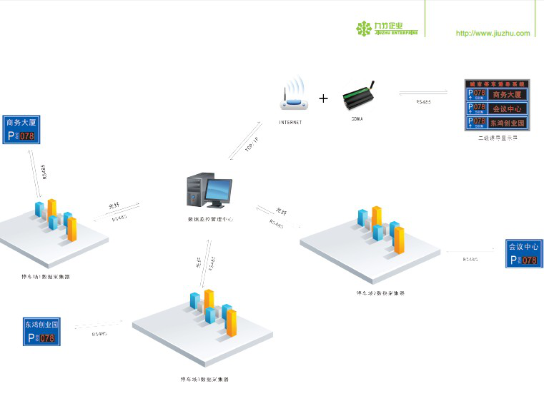 本系統(tǒng)實(shí)時(shí)的采集各停車場(chǎng)的車位數(shù)據(jù),通過(guò)光纖及時(shí)發(fā)送給數(shù)據(jù)監(jiān)控管理中心,數(shù)據(jù)經(jīng)分析處理后再以無(wú)線傳輸?shù)姆绞郊皶r(shí)地把各停車場(chǎng)的